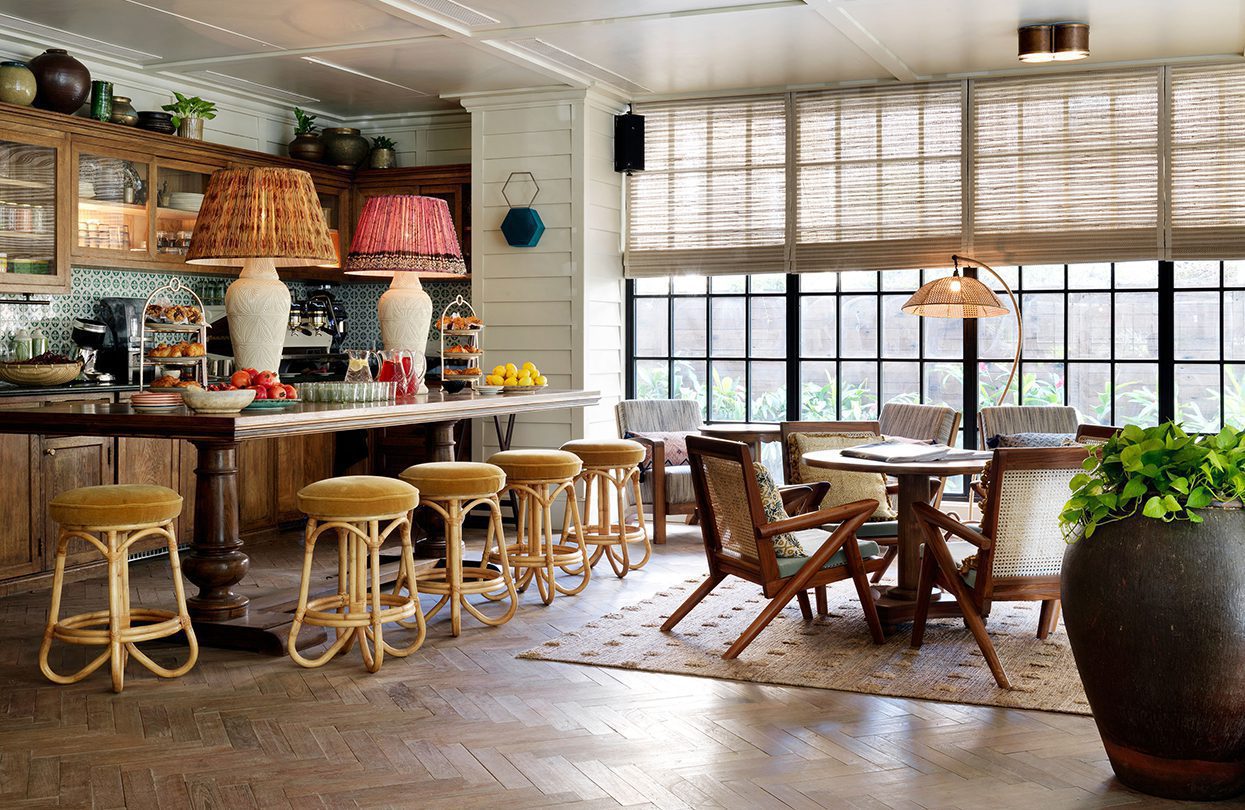 Every room recalls elements from Indian culture and design, including sisal carpets, lampshades draped in sari fabric, and meticulous woven-cane furniture. Much of the fittings in the new Soho House Mumbai are locally sourced, some vintage, some custom-made for the property.